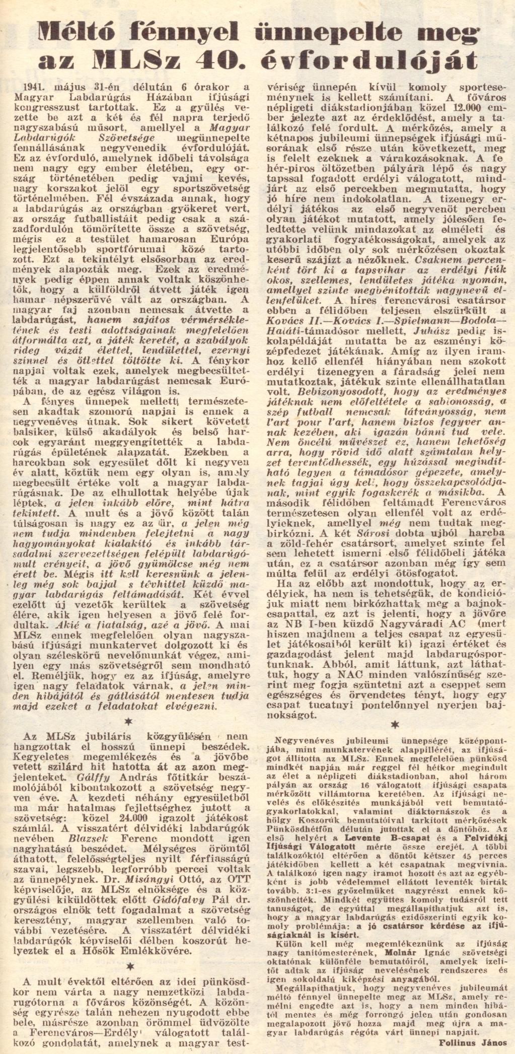 Ünnepi keretek között bonyolították le a Ferencváros - Erdély-válogatott revánsmérkőzést. Mint ismeretes a Ferencváros ősszel 6:2 arányban kikapott Erdély válogatottjától. A revánsmérkőzést 1941. június 2-án, Pünközsdvasárnap gyönyörű napsütéses időben rendezték, tizenkétezer néző előtt. Az FTC 3:1 (0:1) arányban győzött.